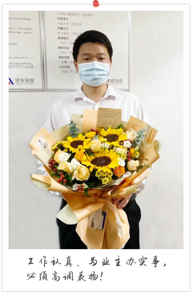沒有講過的故事還有很多,沒有提到的物業人也有很多。7月19日上午10點,一束鮮花送到了駐馬店·建業森林半島貼心管家趙海龍手里,在隨贈的卡片上,業主寫道:“工作認真、為業主辦實事,必須高調表揚!”
