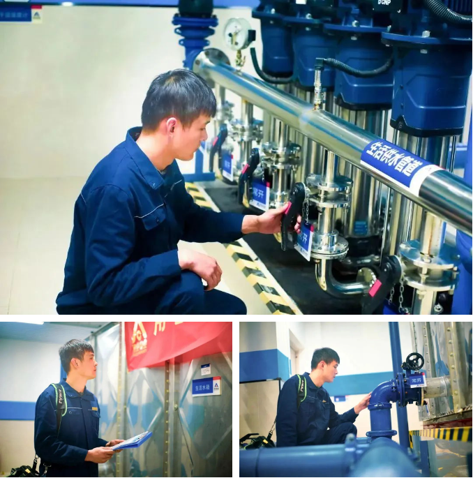 防火甚于防川,對消防泵房進行巡檢是建業物業維修工的重要工作內容之一,他們動用所有感官看、觸、聽、聞:觀察儀表壓力是否正常、檢查指示燈,定期點動測試消防泵,聽設備運行聲音是否正常,聞房屋內是否有異味,以此確保消防系統正常運行。