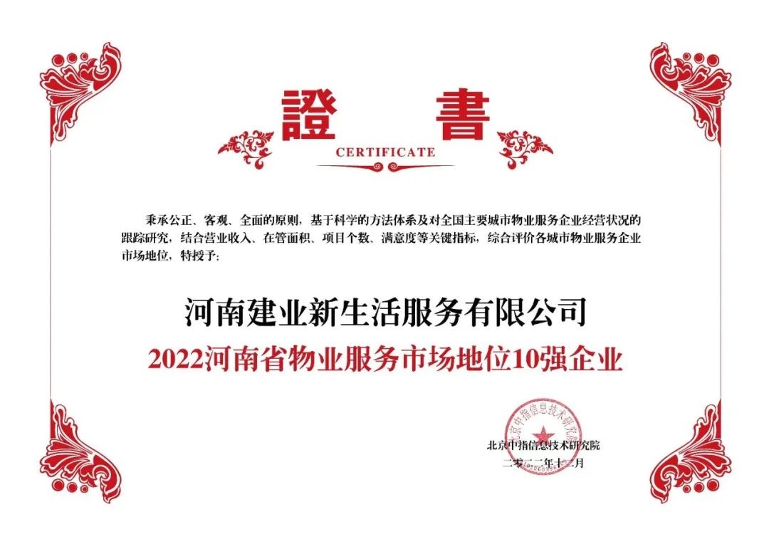 建業新生活憑借多年以來在中部地區穩扎穩打的表現榮獲“2022中部區域物業服務市場地位領先企業(TOP1)”“2022河南省物業服務市場地位10強企業(TOP1)”。