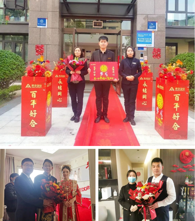 中國人結婚講究挑個好日子,每到年底,婚禮就多了起來。鋪紅毯、送鮮花、貼喜字……在業主的大喜日子里,建業物業人的祝福和服務從不缺席。