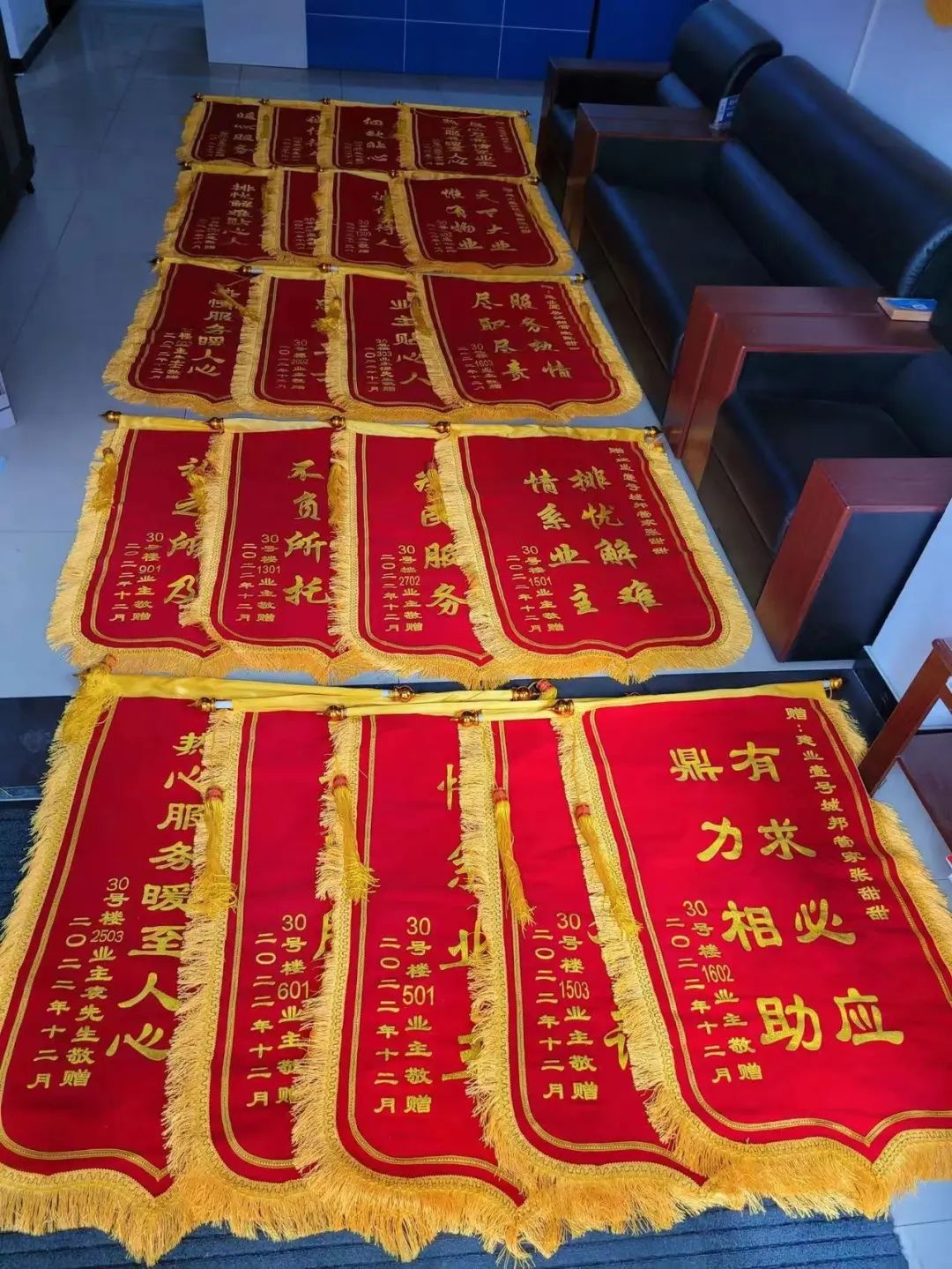 12月8日,剛剛解封不久的新鄉·建業壹號城邦物業服務中心內,業主代表們將21面鮮紅的錦旗送給了貼心管家張甜甜,對她在疫情封控期間的無私奉獻及日常服務中的盡職盡責表達感謝。