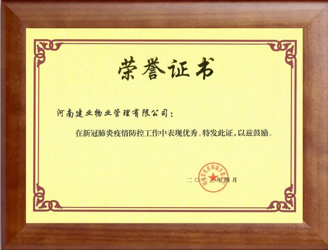 近日,因在過去三年的新冠肺炎疫情防控工作中表現優秀且作出突出貢獻,建業物業獲得由河南省住房和城鄉建設廳頒發的榮譽證書。