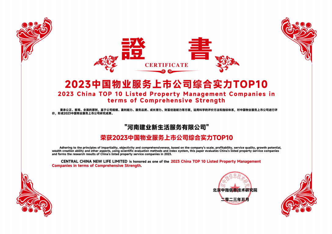 建業新生活榮膺“2023中國物業服務上市公司綜合實力TOP10”!