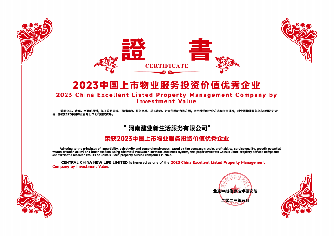 自2020年上市以來,建業新生活不斷拓展服務邊界,憑借持續穩健的發展和卓越優異的成績,成為資本市場物企領域的佼佼者。本次獲得的榮譽也展現了行業和資本市場對建業新生活的肯定和支持。