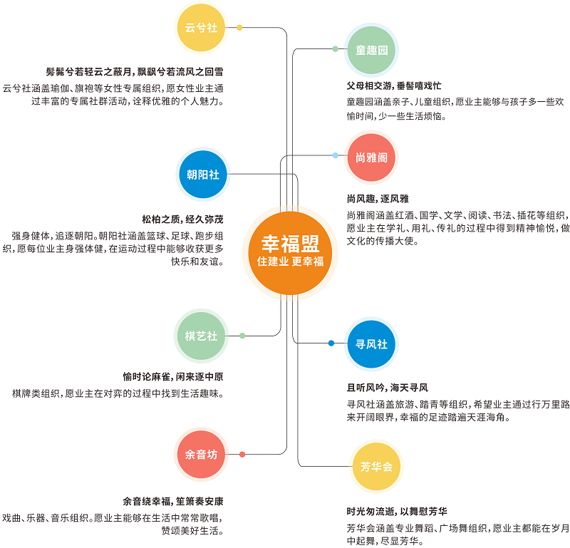針對業主的不同興趣、不同需求,建業物業打造出“幸福盟”社群組織,共分為云兮社、尋風社、芳華會、朝陽社、余音坊、棋藝社、尚雅閣、童趣園等八大分會組織,涉及禮儀、旅游、舞蹈、運動、音樂、棋藝、國學、親子娛樂等多方面興趣需求,定期組織各分會參加大型演出和社會各種公益活動,通過“活動運營+賽事運營+溫情溝通服務”機制,打造完善的社群運營體系,豐富業主文化生活,促進業主間的互動交流。未來,建業物業幸福盟將成為聚合建業物業業主興趣、理想、責任的社群組織。